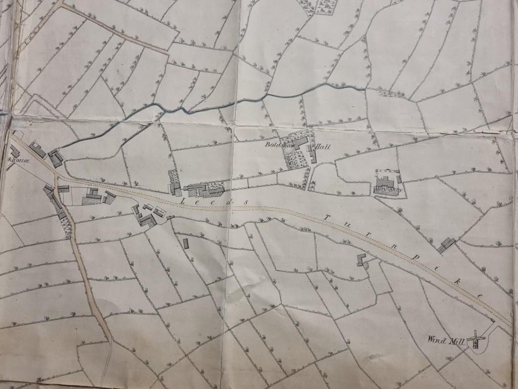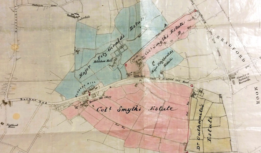 The 1802 map of Bradford does not show evidence of coal mining even if the area examined, like this location along Barkerend Road, was later noted as the site of a substantial pit. The map surveyor may have simply ignored quarries and pits, or possibly such industries were then confined to outer areas like Horton and Heaton which do not feature at all since they were not then considered to be part of Bradford.
