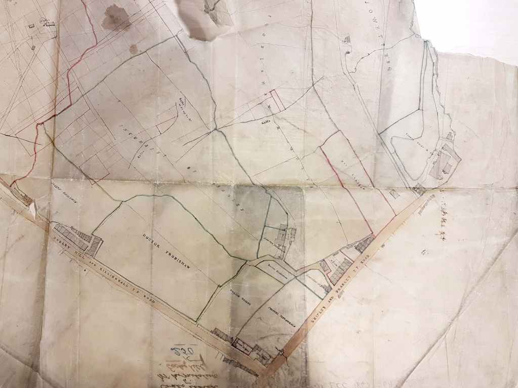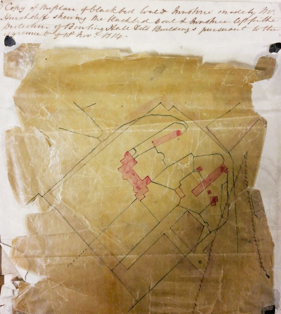 That a sophisticated contemporary mining industry existed is evidenced by my favourite reserve collection plan from 1814. the plan is headed: ‘Copy of the plan of Black Bed coal and ironstone made by Mr Hinchcliffe showing the Black Bed coal left for the protection of Bolling Hall and its buildings pursuant to the agreement of 18th November 1814‘. Pink blocks represent Bolling Hall and its attendant out-buildings. Many of the black lines are property and field boundaries. Some of these make sense today, others presumably delineate parcels of land associated with the out-buildings. This whole central area is slightly paler in colour than the region outside the precinct boundary, which is darker and I assume represents winnable coal. The wavy line, in an inverted V shape to the right, is probably a geological fault. In his description of the area historian William Cudworth reported a Bolling Hall fault which threw minerals ‘down 28 yards to the south’. The removal of the Black Bed and its ironstone naturally left a gap into which the overburden of rock could collapse, resulting in surface subsidence. The common practice was to leave pillars of minerals unmined to support the roof. Under especially sensitive areas, which included churches and the mine-owner’s house, no mining at all took place. To indicate such restraint must be the purpose of this plan.