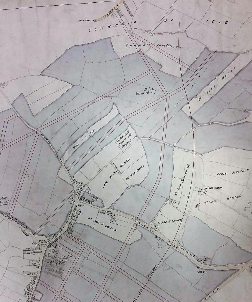 I don’t know Eccleshill well enough to completely interpret my next two maps. The detail above indicates that John Mitchell has now died and shows the location of an engine pit and a gin pit on Eccleshill Bank. It is obvious that a planned street grid has been superimposed on an older map, but I do not think that all those roads were actually constructed.