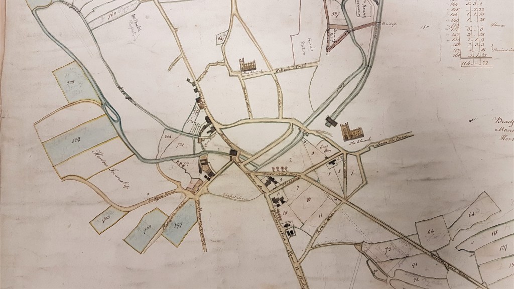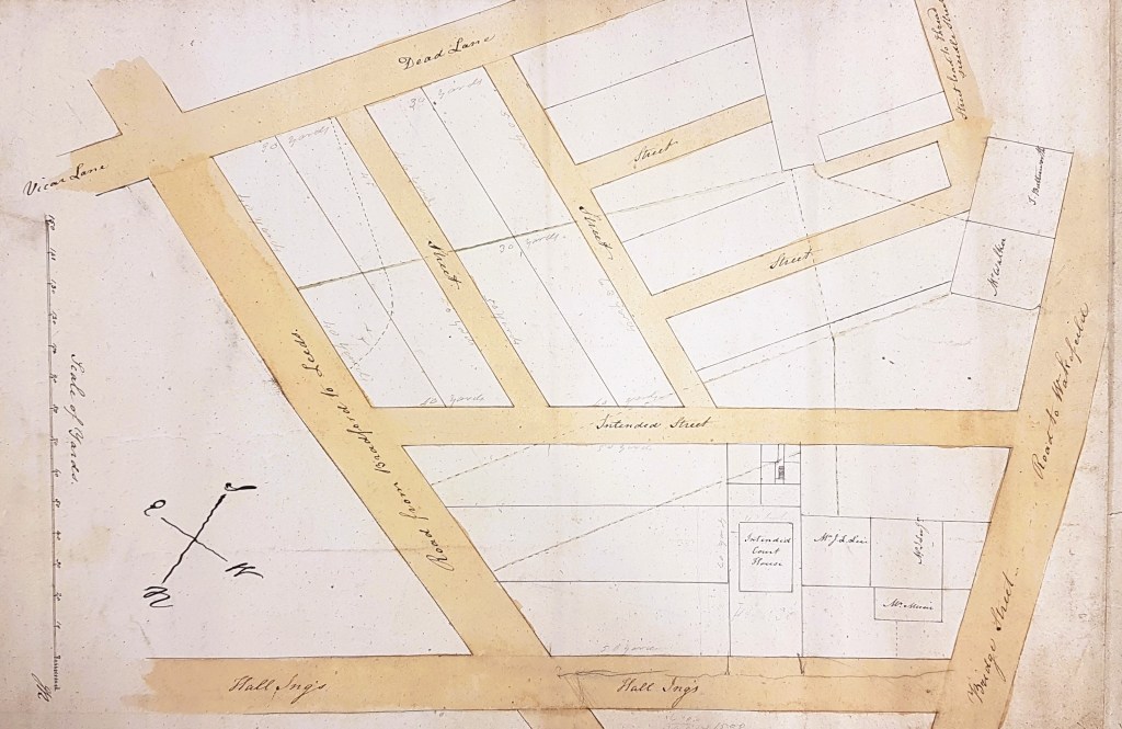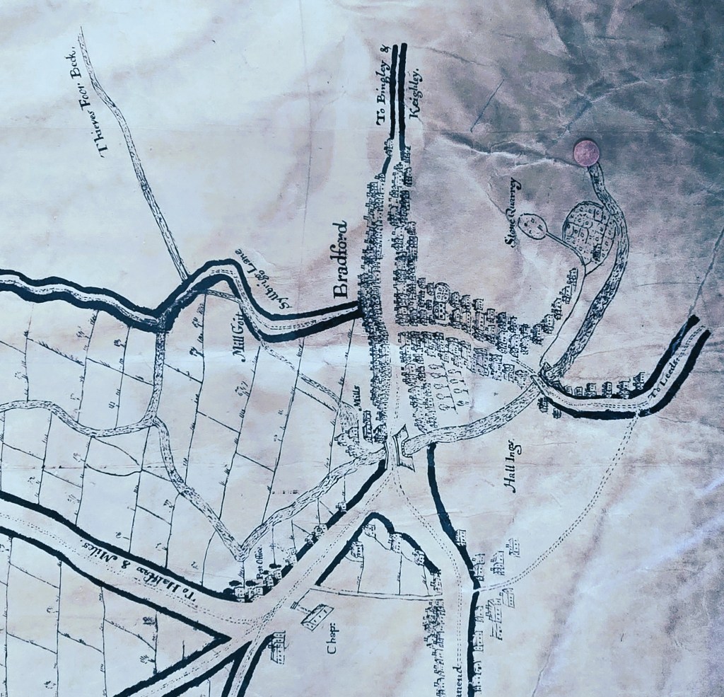 There is an earlier map derived perhaps from the office of attorney Samuel Hailstone (1768-1851). This map is 80 years older than the first and provides a great deal of information about the township of Horton. Bradford itself if really an addendum only. But Chapel Lane and Goodmansend can be readily identified, and we can be certain that ‘Hall Ings’ was a placename in the early 18th century. The land seems then to have been crossed by a path or bridalway rather than a made road.