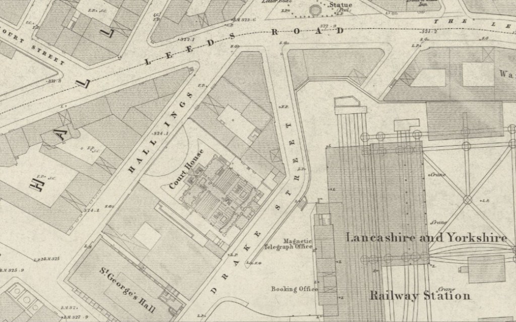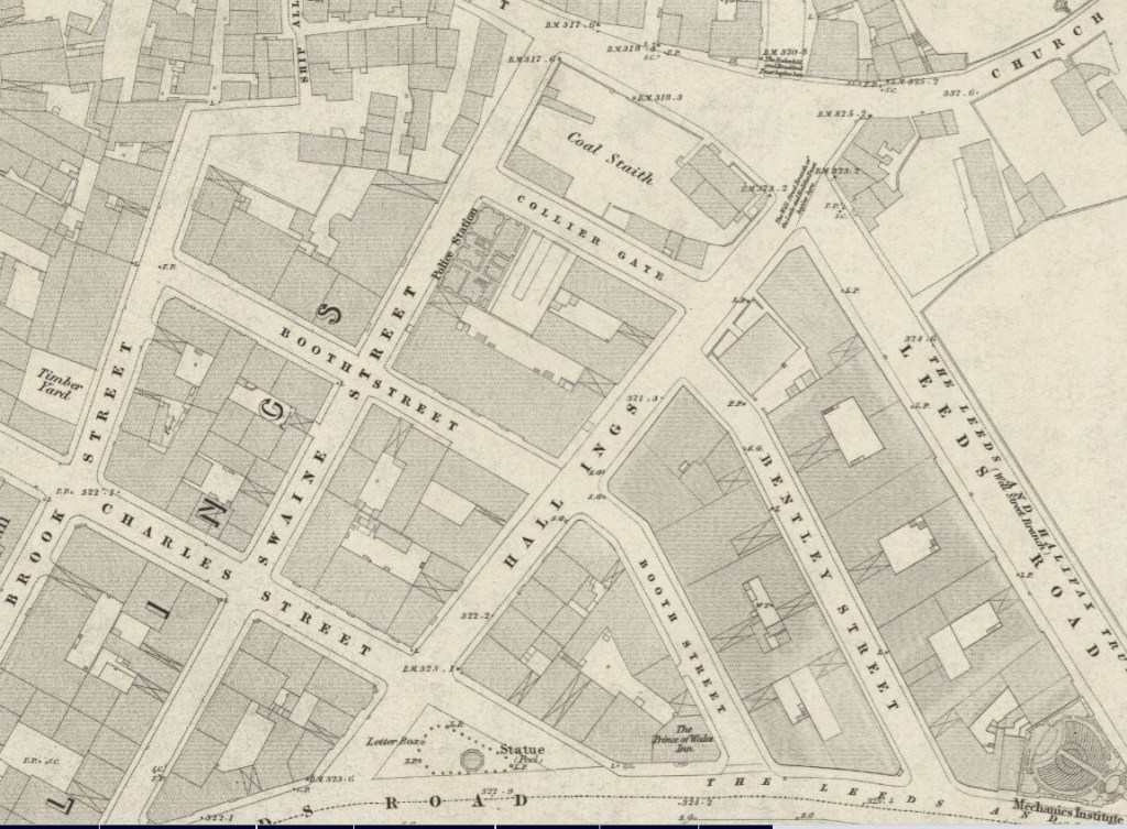 Two important buildings would shortly be erected which are helpful in dating later maps. The Old Court House was constructed in 1834. The formal entrance to the neoclassical Court House building was from Hall Ings. The Hall Ings frontage of this site is now occupied by the Bradford T&A building. In 1850 Godfrey Wright owned the land on which St George’s Hall was built and got £15,000 for selling it (Bradford Observer October 17 1850). The pre-existing buildings were demolished to allow the construction of the concert hall. In theory the new hall should not show on the above map detail since it was surveyed in 1848, but this must represent a somewhat later ‘railway revision’. In addition to these prestige constructions in a generation the whole area has been filled with industrial, retail and domestic units. Hall Ings is surrounded on both sides by a ‘gridiron’ pattern of streets: Swaine Street, Brook Street, Charles Street and Booth Street. These were created by the landowner Rev. Godfrey Wright in the 1830s who used family names to identify them.