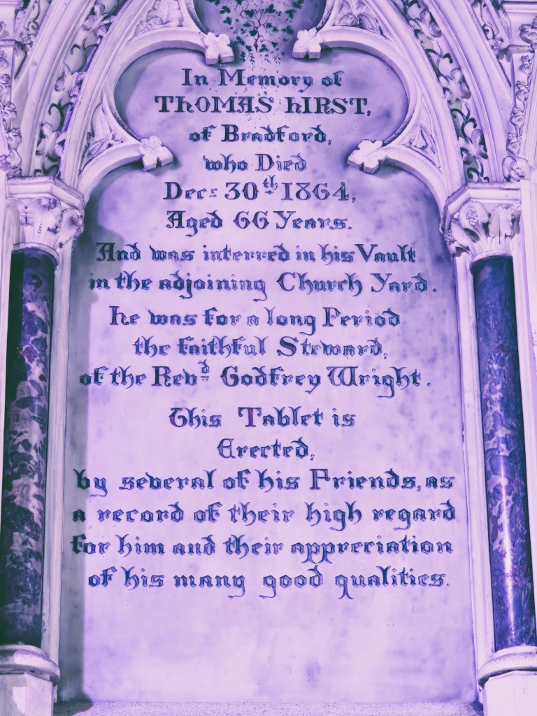 By the mid-1800s Godfrey Wright’s agent was Thomas Hirst of Hall Ings, Bradford. He died in 1864 and his memorial is in Clayton Parish Church.