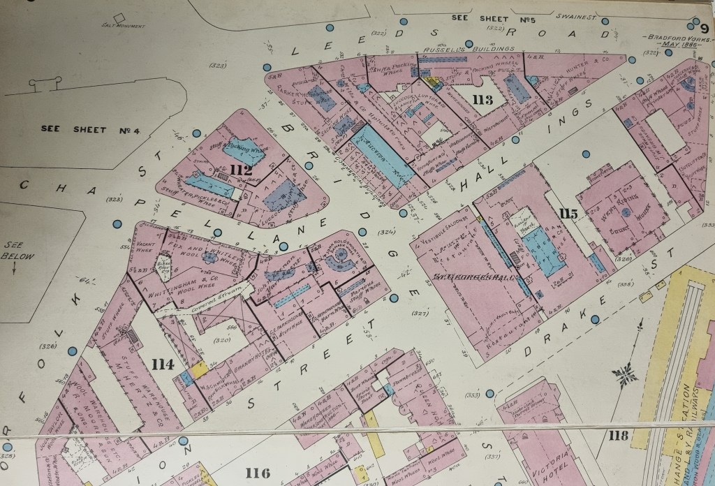 Bradford is fortunate to have an early town map of 1802 of which this is a detail. ‘Hall Ings Road’ is clearly marked and connects Bridge Street (Good Mans End) with the parish church and the road to Leeds (Barkerend Road). An ‘ing’ was a piece of marshy or swampy ground, which once must have been the state of the land surrounding Hall Ings being close to three watercourses, then of course above ground and visible. Who lived in the ‘Hall’ I cannot say.